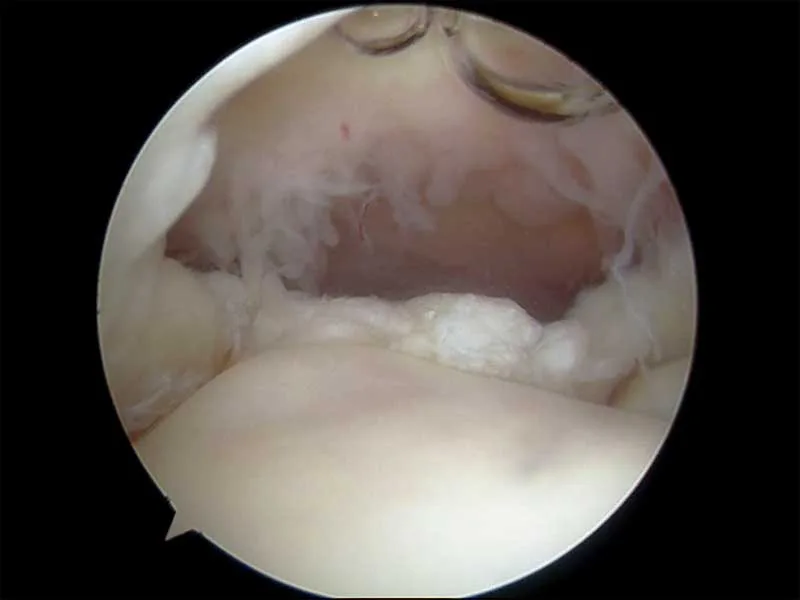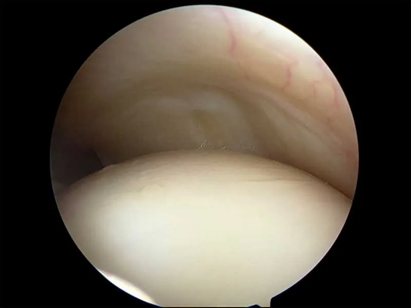 Below are key-hole surgery images inside two different shoulders looking at the smooth cartilage of the humerus (arm bone) below and the rotator cuff tendon above.