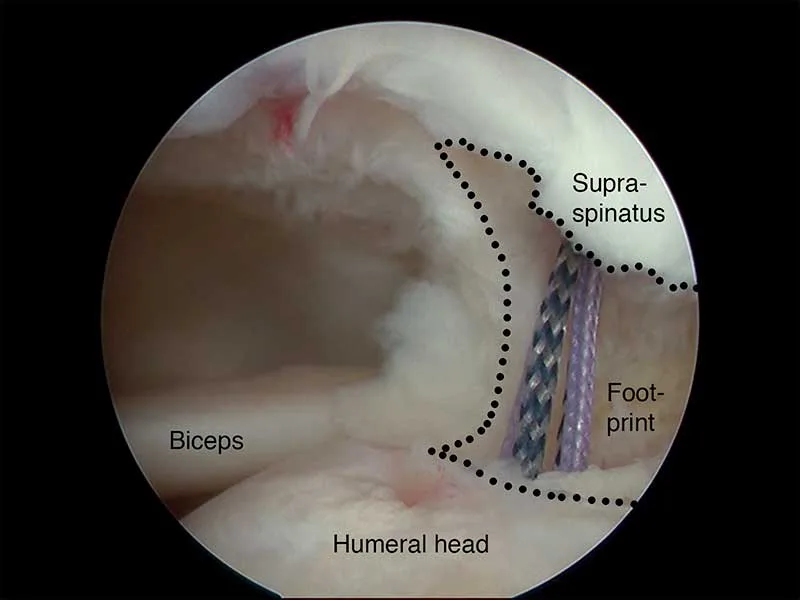 Image of an anchor in the humerus and a diagram showing how the tendon is then stitched into place and repaired